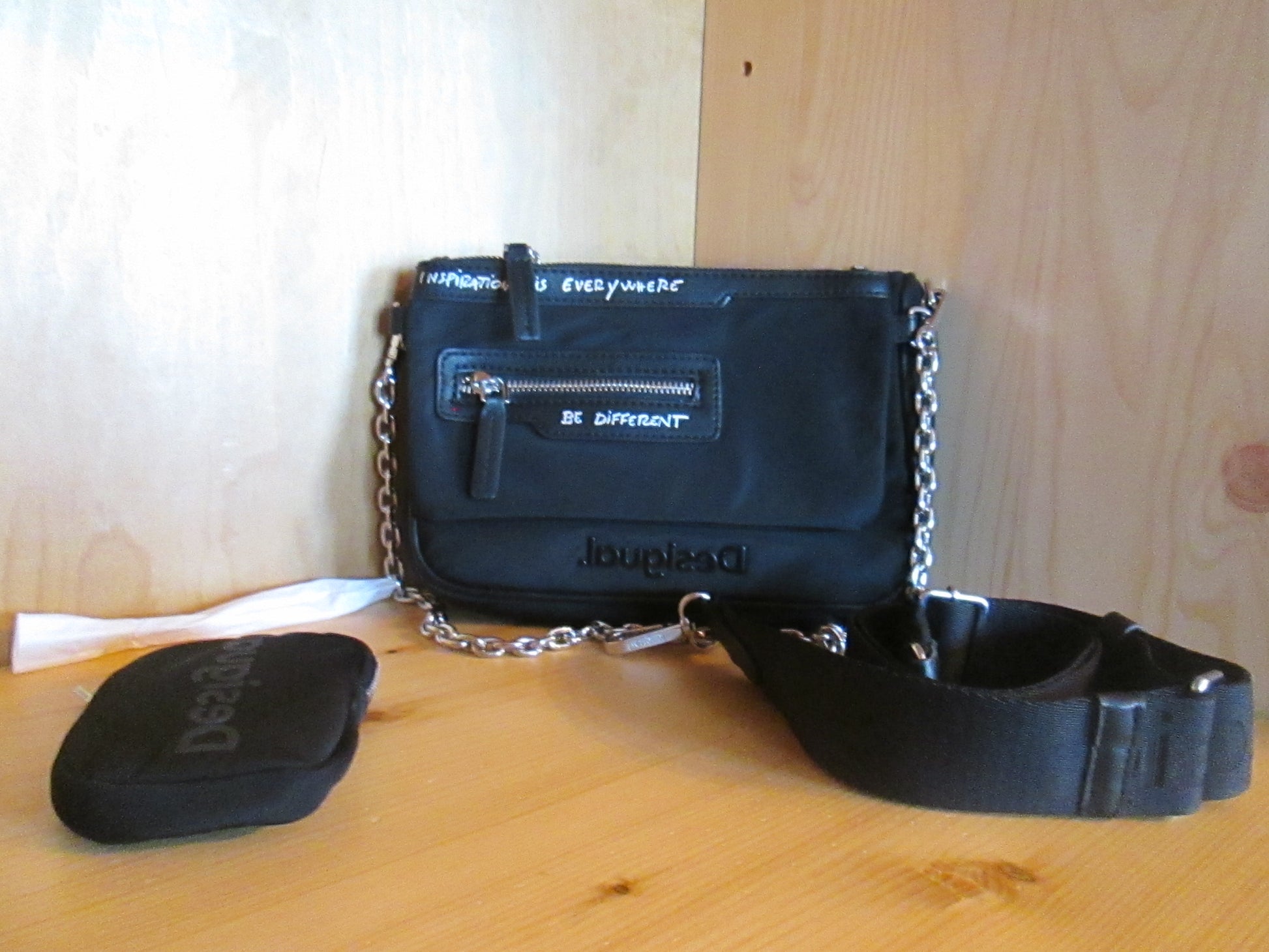 une pochette devant que l’on peut porter seule avec 1 des 2 bandoulières, une grande large et une chaînette plus courte