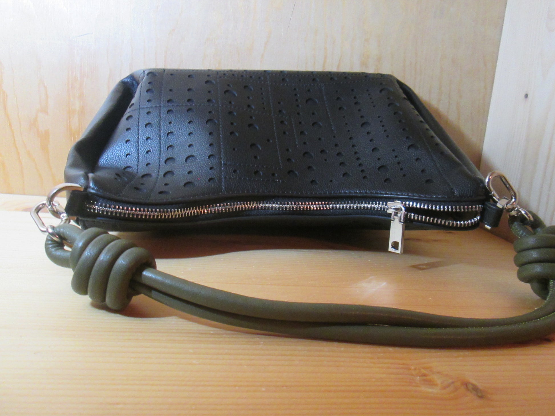 Sac à main en simili cuir perforé avec des cercles de couleur unie, fermeture éclair et poignées amovibles